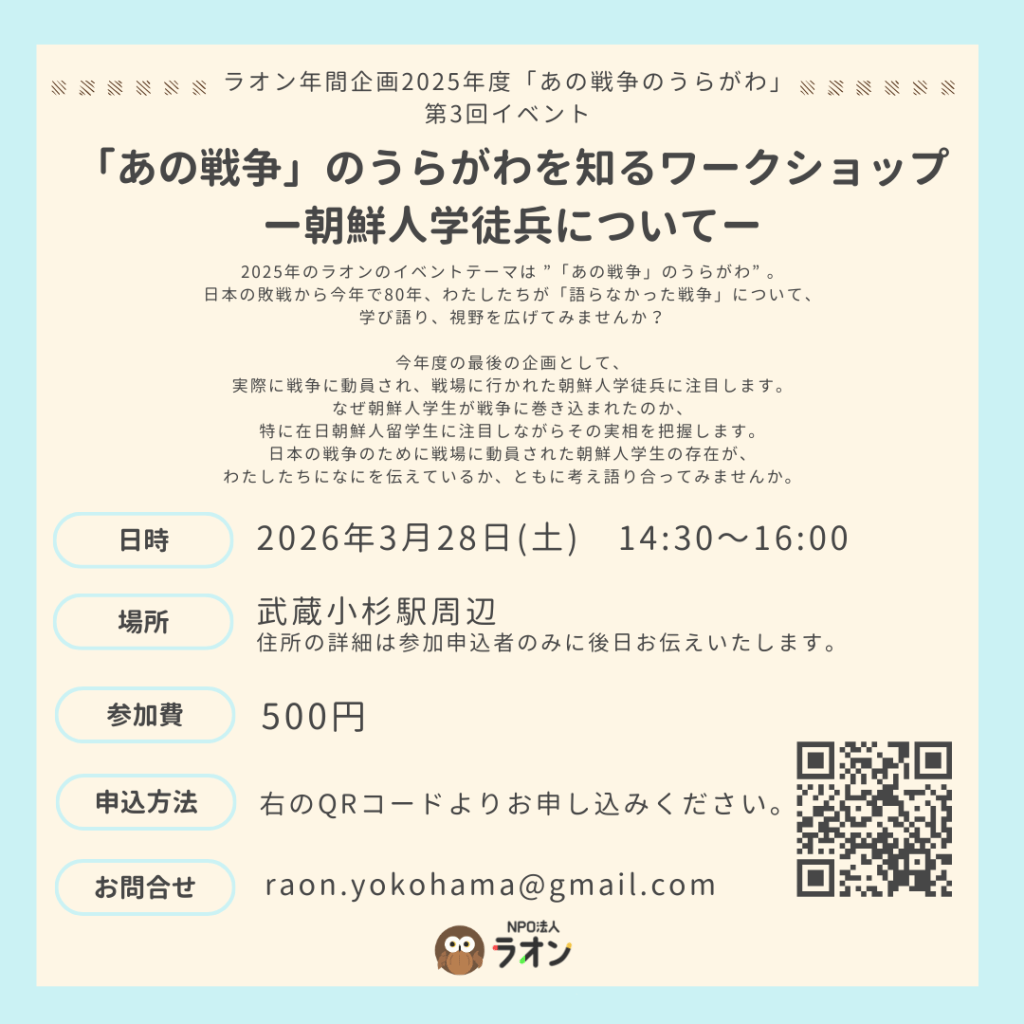 ラオンでは、日本の敗戦80年になる2025年度に“「あの戦争」のうらがわ”をテーマにイベントを実施してきました。